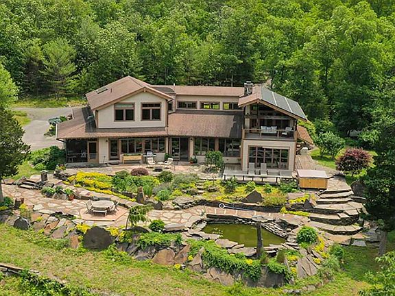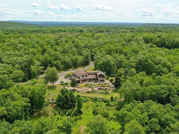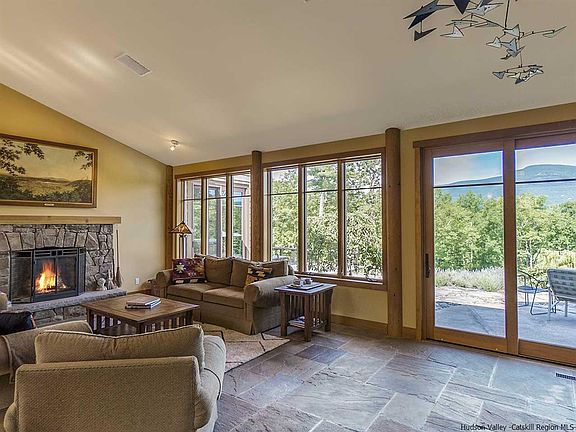 Meander down a tree-lined private drive which opens to dramatic views of Overlook Mountain that rivals the landscapes painted by the Hudson River School artists. This meticulously designed contemporary by architect Barry Price pays homage to the area's arts and crafts influence with accents of bluestone flooring, natural wood columns and interior details. Perfectly sited to the southwest, nature is invited indoors by the use of expansive glass panels and windows as you watch the glorious seasonal sunsets from nearly every room. The spacious main living area has an open floor plan which includes a true chef's kitchen (homeowner is a well-known local chef and author) beautiful dining area, living room with vaulted ceilings, bluestone fireplace, soothing fountain and substantial screened porch. A stunning glass walled separate family room which is now affectionately known as "the music room" also serves as an in-home office. The second floor primary bedroom suite with private bath and screened porch balcony is perfect for star-gazing or just quiet moments with a loved one. The owner, a well known local artist created a light filled professional painters studio enhanced with skylights, built-in custom desk and work space with ample storage. This versatile room could be transformed into a home theater, play area or bedroom--there are endless possibilities for this space! If you yearn for a picturesque landscape, the owners vision has matured the property into a paradise with perennial flower gardens, terraces, bluestone walkways, patios and handcrafted benches. A focal point in the garden is the bluestone plunge pool where you can cool off and the waterfall that flows between the stones was so carefully constructed, it looks like a natural pond. The gardens were professionally designed by the artist/engineer Jon Kahn who created this magnificent outdoor living space. Off to the side of the house is an 8-person hot tub which is perched on a deck with mountain views and a refreshing outdoor shower. Radiant-heated floors, solar panels, large basement and two-car garage complete the picture. This oasis is surrounded almost entirely by lands owned by Opus 40, which ensures privacy and view protection. Only 5.6 miles to Woodstock Village and 5.7 miles to Saugerties Village, both vibrant communities with great restaurants, culture and year-round activities. 2.5 hours from NYC.