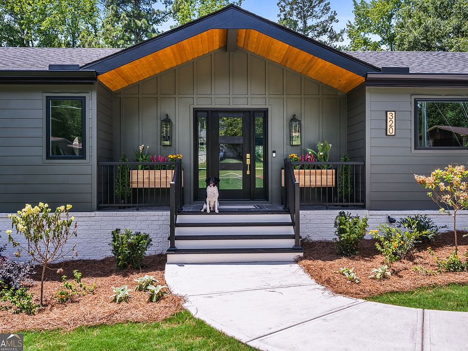 Welcome to your brand new, modern sanctuary in the heart of Downtown Alpharetta lovingly and meticulously rebuilt from the foundation up in 2025. This brand-new ranch-style home is as bright and open as it is refined, with soaring 14-foot ceilings, designer lighting, and custom finishes that set the tone for elevated living. With a jackpot location and a spectacular half acre homesite, you're off to a great start. The curb appeal is both sophisticated and clean. Moody tones pair well with lush landscaping, natural cedar accents, slick exterior lighting and a custom glass doorway. Inside, the open kitchen is a showstopper, with a slick FORNO appliance package, elegant waterfall counters, a timeless herringbone backsplash, smooth sight lines, and soft-close cabinetry-all designed for both style and function. You'll love how the kitchen cohesively stretches out with the coffee bar with an additional sink, ice maker and wine cooler. This is how you design to entertain. You'll also appreciate the matching laundry cabinetry, wet sink and an extra powder bath for your guests. The elegant primary suite rests on the main floor, offering a spa-inspired retreat with a large walk-in shower, custom vanities and hardware, and a thoughtfully designed, walk-in closet system. Just down the hall, a beautiful guest suite with its own full bath ensures comfort and privacy for visitors. The terrace level extends your living space with another recreation space, a kitchenette with a sink and beverage cooler, two spacious bedrooms, a full bath, and 800 square feet of unfinished space ready for your vision. The garage comes prewired for your electric vehicle, blending modern convenience with timeless design. Out back, serenity awaits. A rare half-acre lot features mature landscaping, peaceful views of a private lake, and endless potential-whether you dream of a sparkling pool, flourishing gardens, or simply soaking in the calm. All this just minutes from Avalon, Downtown Alpharetta's markets and dining, and award-winning schools. This home brings together high design, everyday comfort, and a location that feels like having it all.