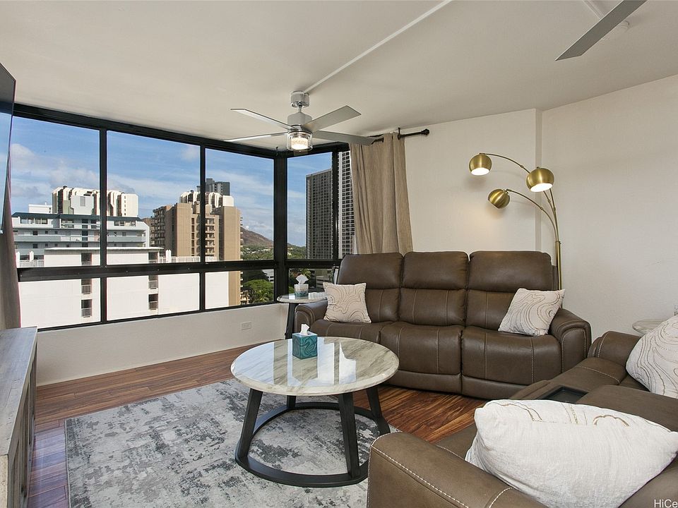 Large corner unit. Bright, Breezy. Ala Wai Canal, Mountain, Golf Course Views. Freshly painted, Koa laminate floors, Open Kitchen, All NEW Appliances, New Shower, Updated vanities, New electrical panel, New Ceiling fans and light fixtures. No popcorn ceiling. Lateral pipes replaced by prior owner. 3 smart TVs included. VA Approved.