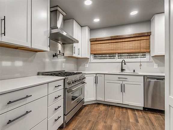 New roof & gutters 9/2025 main home & detached garage. This lovely remodeled home boasts split floor plan, abundant storage, fresh paint, Kitchen Renovated 2024 with Deep Farm sink, 6 Burner Z Line Professional Dual fuel stove & electric oven, Bosch dishwasher, custom kitchen storage, soft close cabinets & drawers, extra electrical outlets, quartz countertops. Hall Bath Renovated 2020 included new tile, sink, countertop, flooring, lighting, shower surround, fixture. Exterior : All New Exterior Windows 2020. Storm Shelter in attached garage. Sprinkler system in front & back yard. Large covered outdoor patios off house12 x58 and detached garage 6x20, Ornamental black wrought iron privacy fence.