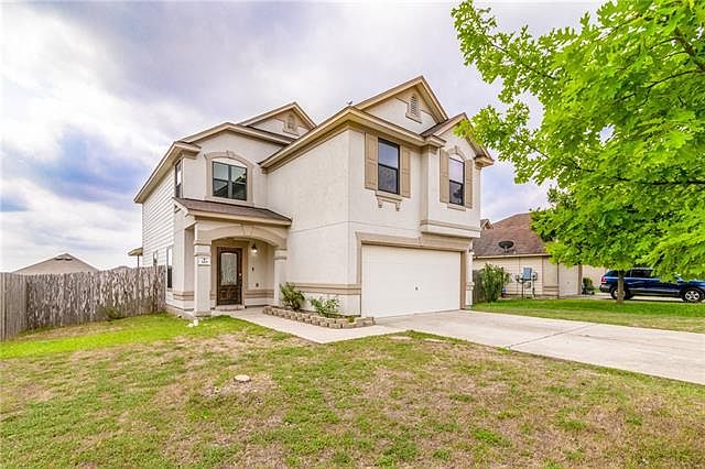 Spacious 2-story, open concept home! This floorplan provides an open and inviting downstairs living and dining area with NO CARPET! Upstairs, you'll find an additional living area, along with three bedrooms. The expansive master bedroom includes a master bathroom complete with separate tub and shower, two sinks, and large walk-in closet. New carpet in master, stairs and upstairs living area. Outside, enjoy the covered deck! Take advantage of the community pool, playground, and City of Kyle trails!