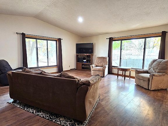 This inviting one-level home offers 4 bedrooms and 2 bathrooms, designed with comfort and functionality in mind. The open-concept layout features vaulted ceilings, main-floor laundry, and a spacious kitchen and dining area with a patio door leading to the backyard — perfect for relaxing or entertaining. The property includes a two-stall attached garage plus an additional two-stall detached garage, providing plenty of storage. Conveniently located within walking distance of public parks, this home combines easy living with a great location.