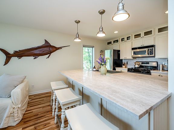Stone tops designer kitchenNear beachHarbor water viewCustom tile bathroom flooringStone top bathroomCommunity poolFrench doors