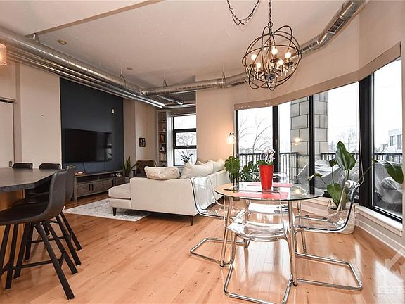Easy Living!!! Fabulous modern and bright corner unit in the heart of Hintonburg. Two beds (one being used as an office) and two baths with spacious balcony. Ten foot exposed ceilings, awesome kitchen features large island with lots of storage and open to the Living and Dining areas. Spacious balcony, hardwood and tile floors throughout and in-unit laundry. Steps to Parkdale Market, restaurants and other amenities. Building provides exercise room, party room roof top terrace with barbeques and indoor parking. Must be seen to be appreciated. Condo fee includes heat and water.