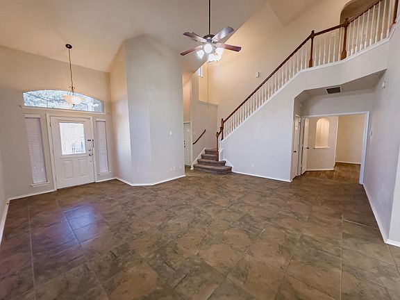 Welcome to this charming 3-bed, 2-bath single-family home with a spacious 2-car garage, where comfort and style come together effortlessly. As you arrive, the generous front yard welcomes you with mature trees and neat landscaping, offering a peaceful view from the covered entryway. Step inside and you're greeted by a stunning double-height living area, complete with overhead ceiling fans and a unique pass-through hatch that opens to the dining room, beautifully accented by a classic chandelier. Just off the dining area, the fully equipped kitchen features a dishwasher, electric range, built-in microwave, stainless steel refrigerator, and a roomy pantry for all your storage needs. The main bedroom sits conveniently on the first floor for added privacy and ease, while upstairs you'll find a versatile second living area - perfect for a cozy lounge, play area, or home office - along with two additional bedrooms. Out back, a spacious, fully fenced yard invites you to relax under the covered patio and enjoy the outdoors in comfort. $500 refundable pet deposit per pet. $25 monthly pet rent per pet. Admin. Fee due upon lease signing: $295. Pet status must be registered at https