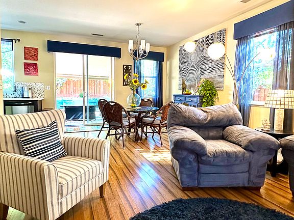 This single-level, 1,455 -square-foot home is clean and move-in ready, perfect for someone who needs comfort and functionality. The layout is open and welcoming, featuring bamboo flooring throughout and central air conditioning and heating to keep things comfortable year-round. The main living area features a couch, accent chairs, a stereo system, a bookshelf, and a dining table that seats four. The kitchen is fully equipped and ready to go, featuring stainless steel appliances, quartz countertops, ample cabinet space, and all the necessary cookware and utensils.
