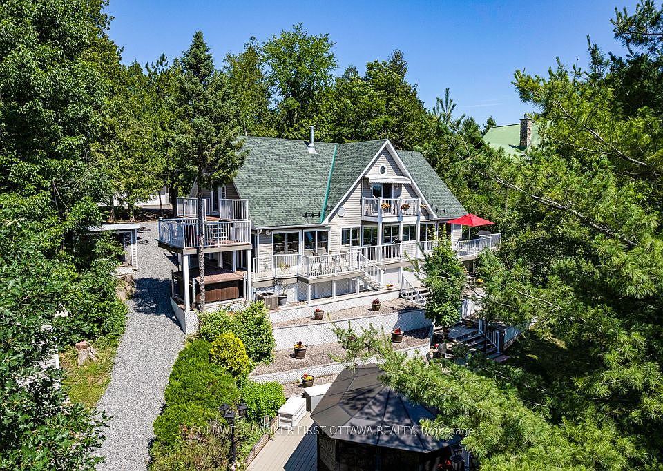On Pike Lake, palatial setting with grand living and leisure spaces for the extended family who enjoys gathering together and entertaining. Tucked into private, exquisitely landscaped, acre is resplendent custom walkout bungalow. You also have exceptional 3-car garage-workshop with attached luxury apartment plus phenomenal 4000sf loft for game nights, memorable celebrations and quiet times. Outdoors is like a resort with Tiki bar, band shelter, gazebo, patio, decks, hot tub & bunkie. The 318' lakefront faces west for spectacular sunsets and, has dock with boat lift. The bungalow home showcases premium quality & family comfort. Big welcoming foyer with double closet. Stain glass doors to sun-filled living room with Jotul propane stove, patio doors to wrap-about deck & wall of windows overlooking lake. This wall of windows continues thru dining area to adjoining gourmet kitchen. With gracious style, kitchen offers slate floor, granite counter, island-breakfast bar, Butler pantry and panoramic lake views. Two sets of patio doors to deck & propane BBQ hookup. Main floor has two bedrooms plus 3-pc granite bathrm. Ultimate laundry room sink, endless cabinets, pull-out drying rack & folding table. Mudroom door to deck. Upper floor, primary retreat has ledgerstone propane fireplace, two walk-in closets & patio doors to private deck. Upper floor 2nd bedroom access to another private deck. Sparkling 4-pc bathroom double sink vanity & dressing table. Detached 3-car garage-workshop has huge gym plus, attached apartment/in-law suite featuring cozy propane fireplace stove in livingroom, contemporary kitchen with breakfast bar, large bedrm, 5-pc bathrm & laundry room. The remarkable loft is world onto itself; lounge, propane fireplace, solid cherry wet bar, space for pool table & home theatre. Loft also has 900sf private office & 2 workstations. Home & apartment/loft each has 2023 propane furnace/central air. Private road upkeep & snow removal $1,048/24. 15 mins Westport or Perth.