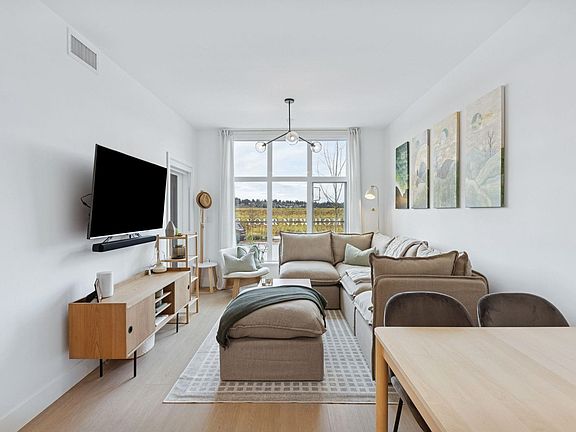Discover elevated coastal living at Highstreet Flats in Southlands, Tsawwassen. This 880 sq ft, 2-bedroom + Den residence showcases an open-concept design with refined finishes like the gourmet kitchen with quartz countertops and premium Fisher Paykel appliances. This home offers a generously sized primary bedroom with a spa-themed ensuite. A private covered balcony provides the perfect setting to relax. This almost-new home also features high ceilings, a private entrance, parking with roughed-in EV charging, and an energy-efficient heat pump for both heating and A/C maintained through strata. Ideally situated in the heart of the charming Southlands community, just steps from Earthwise Garden, local markets, cafés, restaurants, Centennial Beach, and Boundary Bay. Apt only showings.