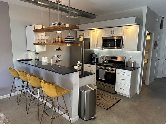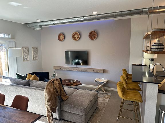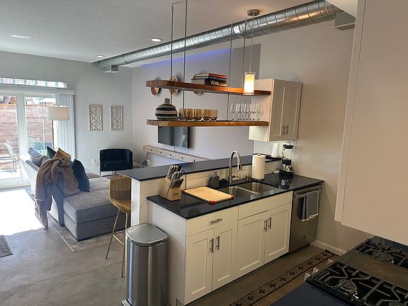 Gorgeous fully furnished 2-bedroom/2.5-bath townhome in sought-after Village of Los Ranchos in Albuquerque's charming North Valley. Built in 2022. Open floor plan downstairs features living/dining area and contemporary kitchen with stainless steel appliances and quartz countertops, dedicated pantry, 1/2 bathroom with washer/dryer, and individual back patio with side yard parking. Upstairs features 2 bedrooms with individual full baths for each bedroom, built-in work stations and generous closet space. HVAC/refrigerated air. Oversized, insulated, finished 2-car garage. Walk to grocery, bakery/cafe, neighborhood pub along charming North 4th St. Close to biking and hiking trails and river. Easy drive to Downtown, Old Town/Sawmill, UNM, and easy entrance to I-25 freeway. Utilities included. Non-smoking property. Quiet pets considered; pet deposit & monthly fee will apply, if approved.
