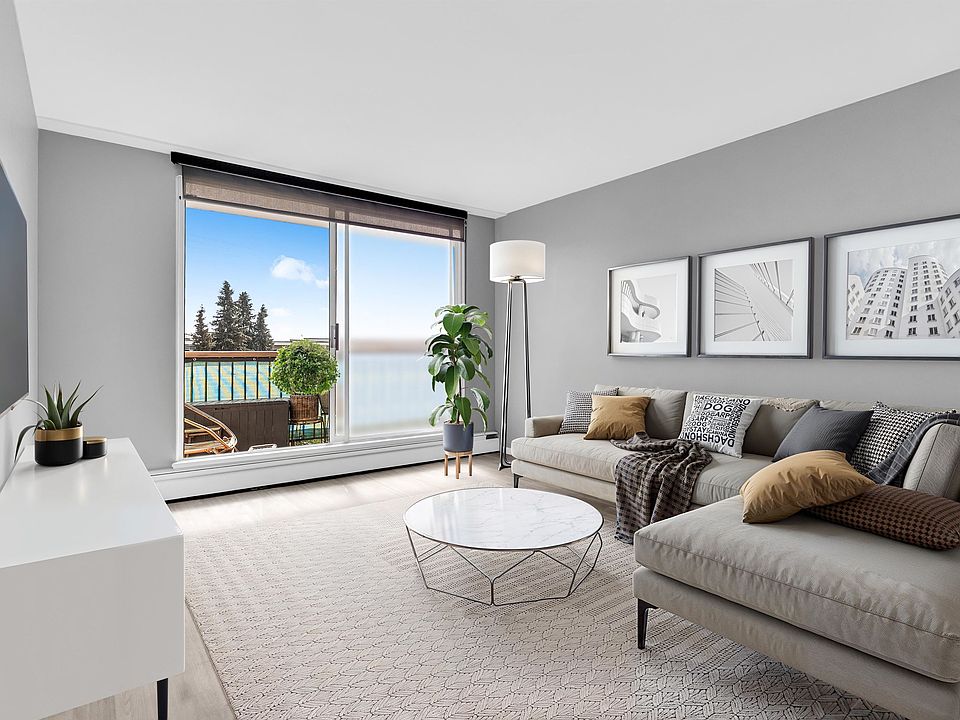 Beautifully updated 1-bedroom, 1-bathroom condo with 491 SQFT located at 320 Royal Avenue, New Westminster. This bright southeast-facing home offers plenty of natural light, a spacious open layout, and a large private patio with peaceful city and water views. The kitchen features modern white cabinetry, stainless steel appliances, and a sleek tile backsplash, while the bathroom includes a deep soaker tub and stone countertop vanity. The bedroom is bright and spacious with ample closet space, finished in neutral tones throughout. The concrete building is well managed and offers great amenities including a games room with billiards and table tennis, a bike room and a shared laundry. Ideally located just minutes from Columbia SkyTrain Station, Douglas College, shops, cafes, and parks - perfect for anyone seeking a stylish and convenient home in Downtown New Westminster.