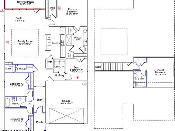 The Gwinnett is a one and a half story home featuring five bedrooms, three full baths with an upstairs guest suite. The primary bedroom is split from the secondary bedrooms and has a large walk-in closet, five-foot walk-in shower, dual linen closets and a water closet. The main living area is open with a spacious trayed ceiling family room, eat-In area, and kitchen. The kitchen includes a large island and walk-in pantry. The living area is extended to the outside with a fantastic, covered porch. Upstairs you will find a guest suite with full bathroom and clothes closet. There is also walk-in attic access.