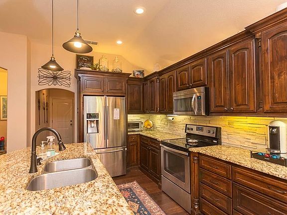 Centrally located heart of Hideaway. Close to largest park, pool and beach area! Backyard oasis. Private backyard covered patio extends to two tiered deck to hang with your friends and family. Beautiful grass areas you can relax beneath towering trees. Arched doorways, high ceilings and classically stunning touches throughout. Open concept floor plan corner gas log stone fireplace in living area, stone breakfast bar granite counters and stacked stone backsplash. Split bed plan also includes breakfast nook and formal dining area. Primary bed plenty of room for sitting area, bath separate tub and walk in shower. Oversized walk-in closet built-in drawers and windows for natural light. SPECIAL FINANCING AVAILABLE