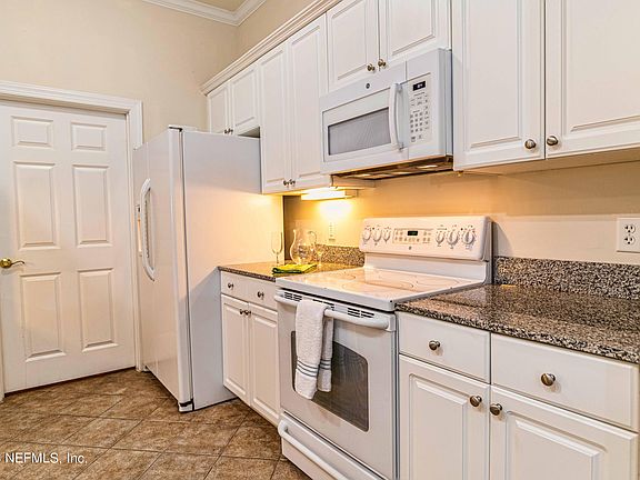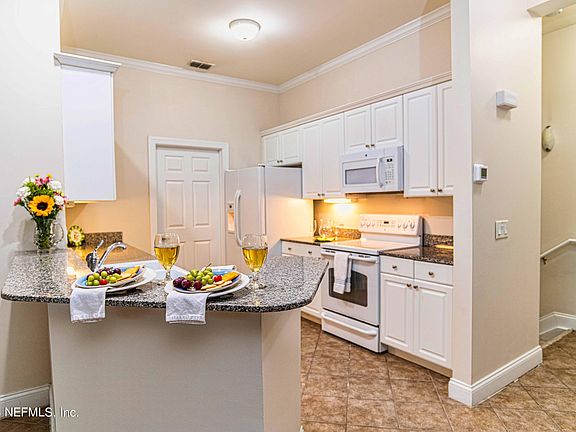 Very spacious 2 bedroom, 2 bath condo in The Legends at St. Johns with attached garage. Entrance on first floor with stairs leading up to the living area on 2nd floor. Garage has large storage area. No elevator. Very well maintained and clean unit with granite counter tops and large screened lanai overlooking the wooded preserve. Tile throughout all the common areas and carpet in bedrooms. All appliances included plus washer and dryer. The community has 2 swimming pools, tennis courts, exercise room and putting green.
