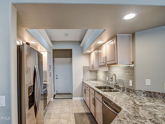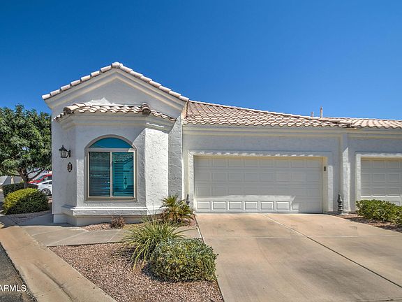 Immaculate, smoke-free, pet-free home w/2 Master Suites! 2 BR, 2 BA, double garage, covered patio, spacious courtyard. Over $46k in improvements! Granite countertops in kitchen & baths; granite custom suspended desktop in bedroom #1. All new SS appliances. Stunning tile backsplash in kitchen. Cathedral ceilings in kitchen & living room, 9' ceilings in all other rooms. Wall mounted TVs in living rm & both bedrooms. Master shower is oversized w/floor-to-ceiling wall tile W/penny tile accents & spot-resistant plate glass enclosure. Courtyard has been renovated w/pavers to expand functional living space and beautifully finished. Community heated pool & spa. Convenient location w/keyed gate to walk to Albertsons & shopping center. Too many features to list! Must see! Furnishings available.