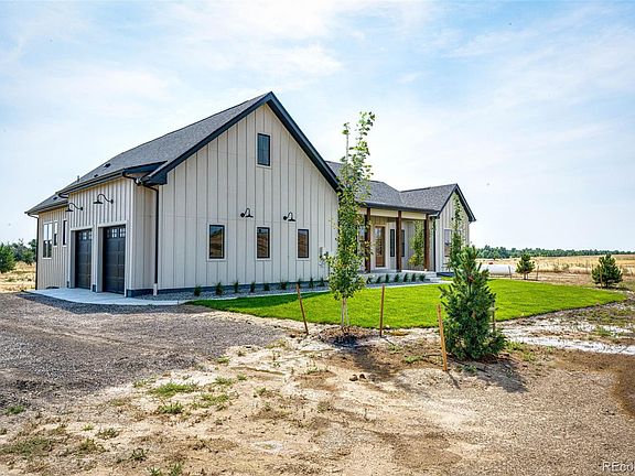 Welcome to Creekside, this beautiful modern farmhouse on premium 35 ACRE lot is nestled along West Bijou Creek with creek access and just a short walk to the golf course. NEW CONSTRUCTION brought to you by Bradbury Companies, who love this charming small town known for its friendly neighbors and peaceful pace. Photos do not do this location justice, an amazing acreage with trees, views and privacy. Step inside THE FARMHOUSE and fall in love with the open, convenient floor plan and high end finishes including stunning hard wood floors; the perfect balance between luxury and livability. The kitchen is the statement of the great room with granite, a dual fuel range, cafe appliances and Pottery Barn light fixtures. The pocket office and butler pantry are modern amenities you will enjoy. A split floorplan, the large primary suite and main floor laundry are privately tucked on one end with the guest suites complete with jack/jill bath are on the other. Primary suite is stunning with deck access and amazing views even from the freestanding tub. Spa like bathroom and large walk-in closet. Covered deck off backside will be your favorite retreat for coffee and sunrises or cool evening shaded BBQs. The basement is unfinished ready for your touches, 10 foot ceilings and walk out access in a basement with tons of natural light. A high end home that is looking for its owner, this one will not disappoint even the pickiest of buyers. Located just minutes from I70 the location is ideal whether you commute or just like easy access to DIA. Rare find offering a peaceful country feel with upscale details—all in a small town where community still matters. Incredible Financing Incentives Available! Seller is offering a 2/1 buydown, reducing the buyer's interest rate by 2% the 1st year and 1% the 2nd year. In addition, preferred lender is waiving lender fees. These combined incentives could significantly reduce the monthly cost. Contact listing agent for full details.