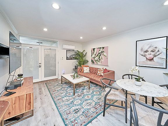 Seller is a broker. 1 Bedroom + 1 Bathroom with large living room and large patio with side entrance.  Laundry in unit. AC unit in livingroom and bedroom. New Cabinets, New Countertop. Appliances included. 1 Parking space in garage. AS IS