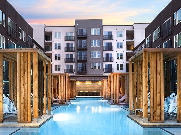 - Exterior features: Bicycle storage, Biergarten, Built-In Shelving *, Business Center, Courtyards with Seating & Grills, Custom Kitchen Cabinetry, Designer Tile Kitchen Backsplash, Electric Vehicle Charging Stations, Four Dog Parks & Pet Spa, Granite & Quartz Countertops, Instructor-Led Fitness Classes, Live + Work Layouts, No Breed or Weight Restrictions, Package Receiving, Private Yards *, Smart Thermostats, Soaking Tubs & Walk-In Showers *, Stainless Steel Appliances, Studio, One-, & Two-Bedroom Floorplans, USB Outlets, Walking Distance to Trinity Groves, Wood-Style Flooring