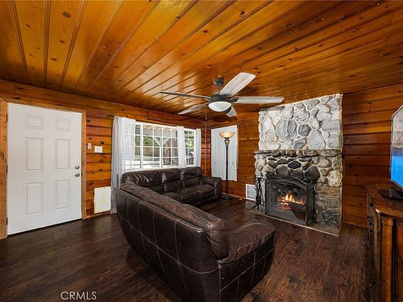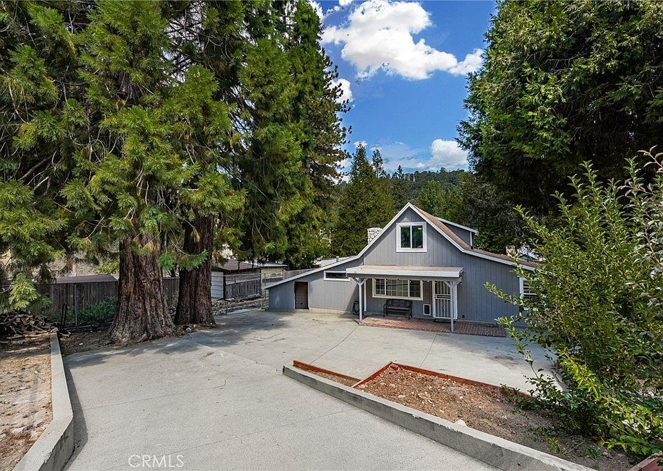 Tucked into a secluded and peaceful cul-de-sac in the picturesque Valley of Enchantment, 320 Skyview Lane is a spacious and welcoming cabin comprised of 4 bedrooms and 2 bathrooms in almost 1,500 sq feet of living space. A fully gated property and driveway provide additional security and peace of mind, ample parking is found in the large front yard with an expansive concrete driveway. A red brick covered porch leads the way inside to a cozy and inviting living room. Class paneled walls and a handsome river rock fireplace are highlights of the living room with laminate wood flooring. An open concept kitchen enjoys ample counter space, appliances including a gas range, dishwasher and built-in microwave and a convenient and generously sized dining area. A remodeled ¾ bathroom features a custom vanity and large walk-in tiled shower. Stacked washer/dryer connections are found within the bathroom as well. Off the living room the first bedroom is found with laminate flooring and ceiling fan. Across the living area two bedrooms and a bathroom await. Upstairs a 4th bedroom is found in addition to a loft/flex space. Storage is plentiful outside in the detached shed and the secondary storage area attached to the house. Enjoy this value packed opportunity moments from Crestline and Lake Gregory!