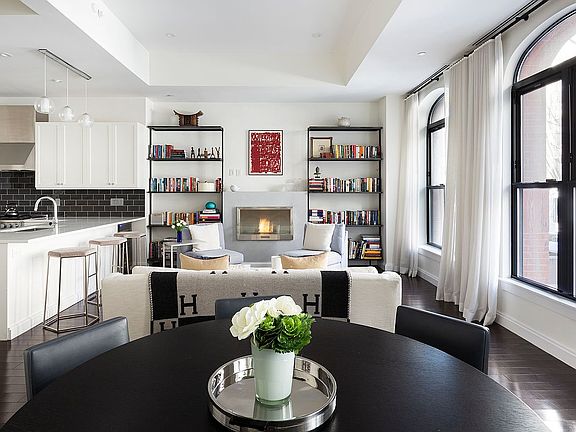 This sun-flooded apartment boasts oversized windows overlooking a charming tree-lined street. This home dazzles with wide plank hardwood floors and soaring 10+ ft ceilings and an oversized great room with a built-in smokeless fireplace.