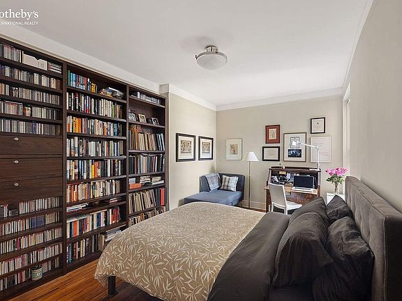 Equally distinguished, the primary bedroom offers a generous sense of scale, easily accommodating a king-size bed and additional furnishings. A large window brightens the space, and all cables have been neatly rerouted through the closet, creating a clean, streamlined look throughout the unit. Blackout shades and a full wall of custom built-in shelving add both charm and functionality, while expansive closet space provides ample storage.