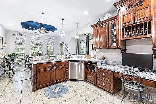 Newly painted throughout. Beautifully designed in the Mediterranean style with modern colors and decorative columns. Fantastic large gas stove. Master bedroom and bath separate/split to its own area. No carpet. Ceramic tile through out. Each room just the right size, not too big or not too small. Great family home.