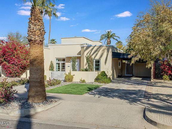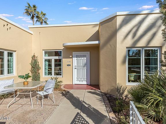 Gorgeous 1930's rare Art Deco on one of the best blocks in popular Willo Historic District! Palm Springs feel, great curb appeal with large gated courtyard to spend mornings/ evenings. Enter into a fabulous great room with 10 foot ceilings with sliding doors and views to the pool. Updated kitchen w/ stainless appliances, gas cooktop, charming breakfast room w/ views to the front. Additional large dining room or flex space for office or sitting room off the living room. Hallway of glass doors to 2 story primary wing w/ media room w/ French doors and cool stairway to upstairs primary suite. Detached casita w/ updated flooring and remodeled bathroom. Main house 2/2 2,2258', casita 1br/1ba 290'. Backyard w/ cool courtyard vibe and gorgeous solar heated saltwater pool/spa.Walk to everything!