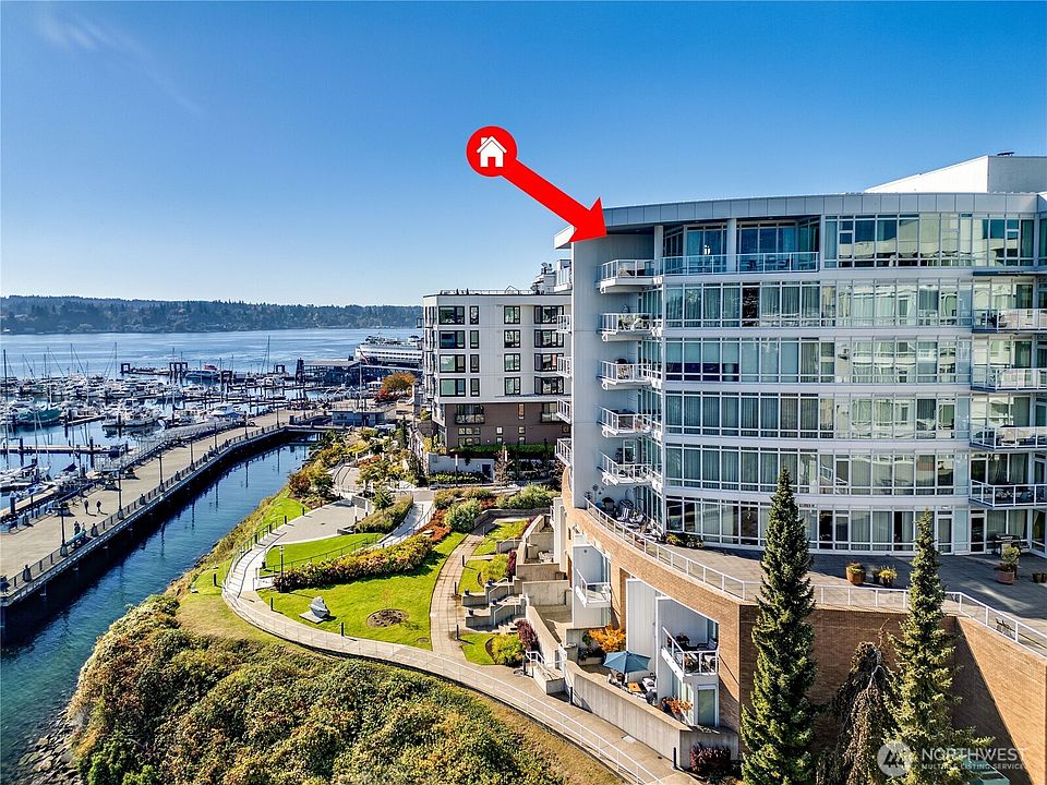Harborside Penthouse perfection, where contemporary style meets coastal serenity. Bathed in natural light, this top-floor gem offers a refined escape with panoramic views of Puget Sound, Bremerton Marina, & Cascade Mountains. Soaring ceilings & floor-to-ceiling windows set the stage for open-concept living at its finest. Entertain in the spacious great room, gather around the sleek Caesarstone island, or unwind on the expansive water side balcony, your private perch above it all. Gently lived in, this meticulously maintained residence blends timeless design with modern comfort. Two secured parking spaces, private storage, and an unbeatable location just blocks from the Seattle ferry. This is the penthouse lifestyle you’ve been waiting for!