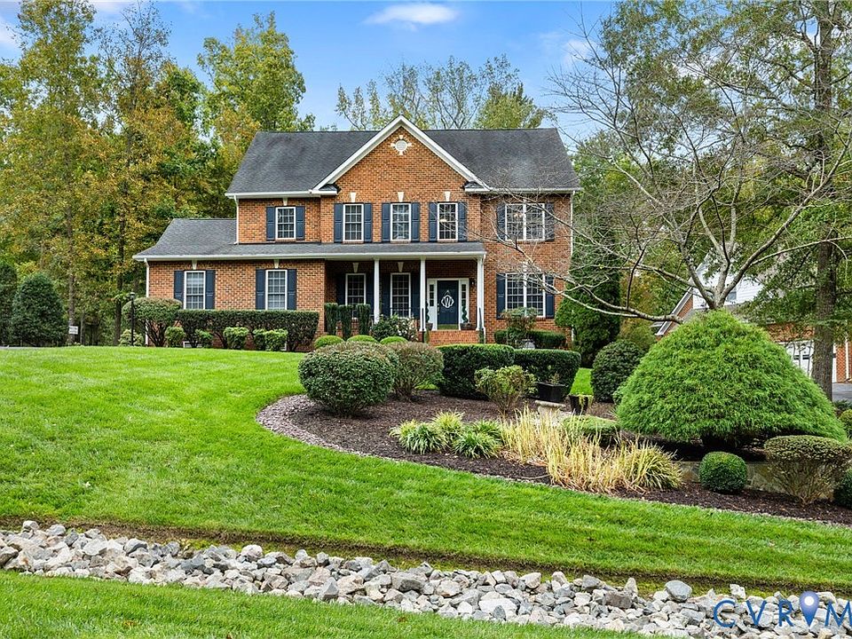 Stately Brick Home in Manakin Sabot! Welcome to this beautiful brick home offering 5 bedrooms, 3.5 baths, and 3,778 sq. ft. of elegant living space. Nestled on a landscaped lot, the home showcases stunning curb appeal with a full front porch and custom plantings. Step inside to find a gracious foyer flanked by formal living and dining rooms, each adorned with hardwood floors, double crown molding, and rich trim details. The dining room features a tray ceiling and chair rail, creating the perfect setting for gatherings. A private first-floor home office includes built-in bookcases and recessed lighting, ideal for remote work. The spacious family room centers around a gorgeous gas fireplace with a decorative mantle and offers seamless access to the rear deck. The gourmet kitchen is a showstopper with granite countertops, a large center island, stainless steel appliances, double wall oven, tile backsplash, and a walk-in pantry. A bright breakfast nook overlooks the backyard and deck, perfect for morning coffee or casual meals. Upstairs, the luxurious primary suite boasts a large walk-in closet and a spa-like ensuite bath featuring dual vanities, a jetted tub, and a glass-enclosed shower. Three additional bedrooms all offer plush carpet, ceiling fans, and generous closets, sharing a full hall bath. The finished third floor adds exceptional flexibility with LVP flooring, a spacious bedroom, full bath, and walk-in storage, ideal for a rec room, guest suite, or in-law space. Outdoor living shines with a large rear deck overlooking a sprawling, private backyard framed by mature landscaping, perfect for entertaining or relaxing. This elegant Manakin Sabot home offers timeless design, abundant space, and a truly inviting atmosphere inside and out.