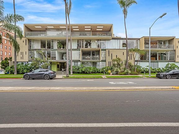 Penthouse-Level Mid-Century Gem in the Historic Salomon Building. Perched atop the iconic Salomon Building, this stunning penthouse level condo is a rare opportunity to own a piece of San Diego history with the added benefit of Mills Act property tax savings. Designed by renowned architect Henry Hester, this residence is a showcase of timeless mid-century modern design, offering expansive Balboa Park views from every room. Step inside to discover an airy, light-filled open floor plan enhanced by floor-to-ceiling windows, recessed lighting, and tasteful mid-century modern fixtures throughout. The home features two spacious primary suites, each with its own luxuriously appointed bathroom, offering privacy and comfort. The sleek chef’s kitchen boasts stainless steel appliances and flows seamlessly into the large living space that opens onto an expansive private balcony with terrazzo flooring—perfect for relaxing or entertaining with panoramic views. Additional highlights include: Smart-controlled thermostat ample closet space and separate storage room two tandem parking spaces plus bike racks access to community amenities including a gym and pool. Centrally located, you're just minutes from the waterfront, Downtown, Balboa Park, San Diego Zoo, shopping, entertainment, and top-tier dining. The home’s warm and soothing color palette completes this perfect blend of comfort, style, and location.