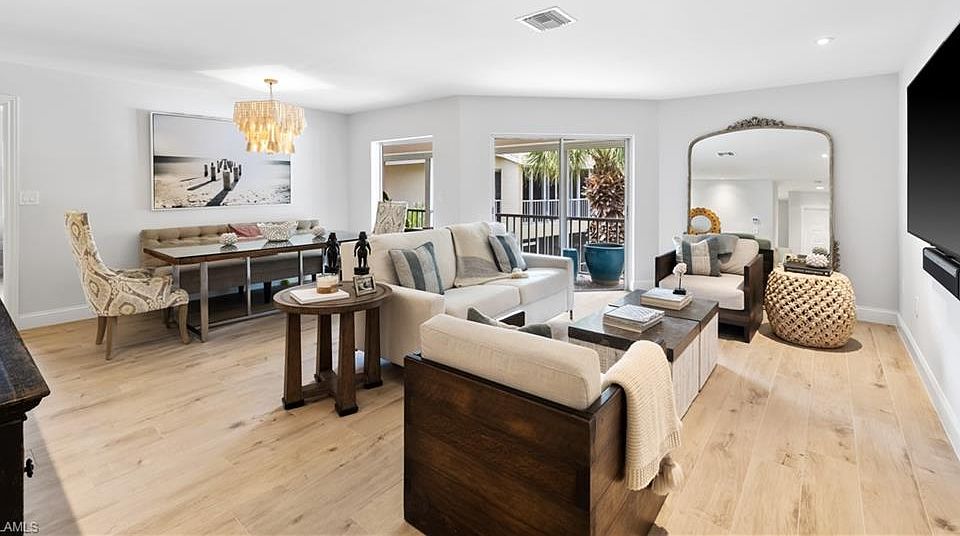 Rare find west of 41. X-zone property—no flood risk. This beautifully renovated end-unit condo has been fully reimagined from top to bottom: impact windows, new doors, high-end appliances, granite countertops throughout, updated electrical, hurricane shutters, new water heater, and more. Nothing to fix, nothing to fuss with—move right in and walk straight to your Private Moorings Beach access.Private carport. Light and bright with western exposure, the home takes in warm afternoon sun and a rich sunset glow. The split-bedroom layout adds comfort and privacy, giving the space an easy, open flow. Residents of Navarra Club enjoy a sparkling community pool, relaxing hot tub, tiki hut,—perfect for those classic Florida evenings and day-to-day convenience. The thoughtful updates and attention to detail make this an ideal primary home, seasonal escape, or smart investment.All of this just minutes from Naples’ white-sand beaches, world-class shopping, top dining, and the vibrant charm of 5th Avenue, as well as Venetian Village, Waterside Shops, and Mercato.Moorings Beach Park membership available.