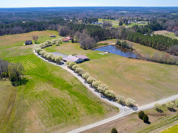 Welcome to The Barn at Vino, a remarkable property in Granville County, NC spanning 60 acres of scenic beauty, featuring a spacious wedding venue and a charming single family farmhouse. The private road adorned with picturesque Bradford pear trees welcomes you, setting the tone for the tranquility and pastoral elegance that awaits. The 4,815 square foot venue has a catering kitchen, handicap-accessible bathrooms, and over 2,500 additional square feet of covered patio space, ideal for hosting a variety of events. Included in the sale is a 1,870 square foot, two bedroom, one and a half bathroom single-family brick home, adding to the allure of this unique offering. With a successful track record hosting weddings, graduations, family reunions, banquets, private parties, and the annual Viking Experience NC Festival, this property presents a turnkey opportunity for business ownership. Additionally, the sale encompasses three large storage buildings currently housing farming and venue equipment, two ponds, covered stage, fire pit, and acres of vineyards, further enhancing its appeal. Don't miss this chance to own a beautiful property with endless potential in a peaceful, serene setting, where every detail has been thoughtfully curated for memorable occasions.