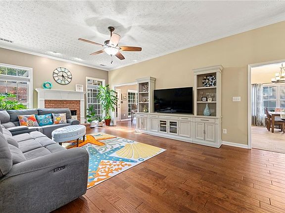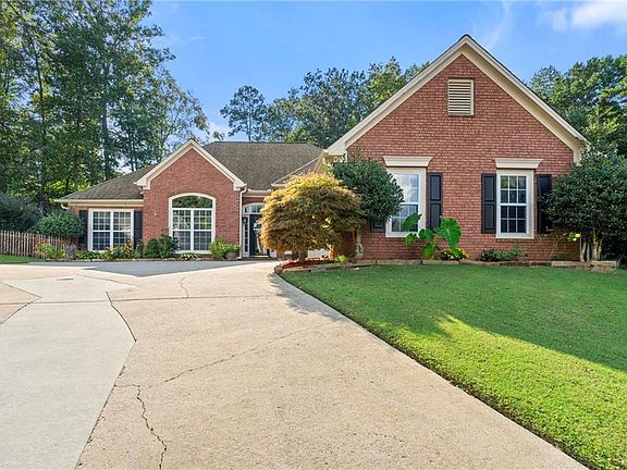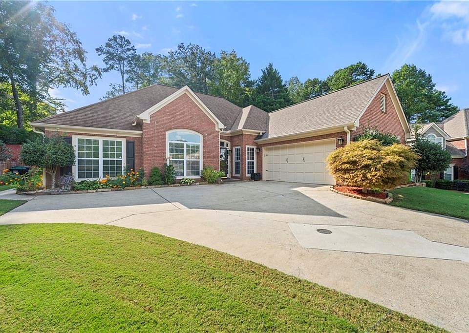 Welcome to this beautifully maintained 3-bedroom, 2-bath brick ranch located in a quiet cul-de-sac lot and established neighborhood. Offering exceptional curb appeal, this home features a brick front exterior, landscaped front/back yard, and an extended driveway leading to a side-entry garage. Inside, the home features hardwood floors, vaulted ceilings, and abundant natural light throughout. The spacious family room includes a ceiling fan and a cozy fireplace. A formal living room and dining room provide additional gathering spaces. The kitchen is equipped with granite countertops, stainless steel appliances, a stylish backsplash, and ample cabinet storage. The breakfast area with large windows overlooks the backyard, making it ideal for casual dining. The owner’s suite has vaulted ceilings, a generous sitting area, and a spa-like bath offering dual vanities, a separate glass-enclosed shower, and a large walk-in closet. Two secondary bedrooms are well-sized with hardwood floors and share a full bath with updated finishes. Additional features of this home include two 50-gallon hot water heaters and low-flow toilets, ensuring efficiency and eco-friendliness. Enjoy outdoor living in the screened-in porch/sunroom and patio. A beautifully landscaped backyard with multiple sitting areas, stone retaining walls, and a fire pit. The fenced yard offers privacy and a peaceful natural setting. The community offers swim, tennis, and basketball courts. Conveniently located near the Mall of Georgia, shopping, dining, schools, and parks, this home combines comfort, function, and privacy in a highly desirable neighborhood.