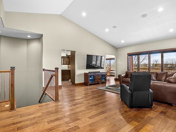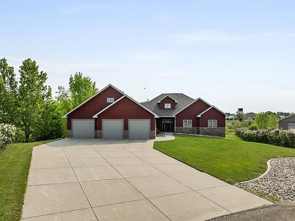 Discover the perfect harmony of luxury and warmth in this stunning property only minutes from Minot, ND. This property features a peaceful and partly wooded lot and a 7’-9’ deep pond, perfect for enjoying nature, wildlife, and scenic views. You just found a beautiful custom-built home on 5 acres that offers an exceptional blend of craftsmanship, comfort, and thoughtful design. With 5 bedrooms, 4 bathrooms, and over 5,300 sq. ft. of living space, this home is a true masterpiece. Step inside to be greeted by vaulted ceilings, rich knotty alder trim and doors, and expansive windows offering an abundance of natural light. The heart of this beautiful home is a spacious living room with tall ceilings, creating an open and inviting space perfect for both relaxation and entertaining. The spacious kitchen is a chef’s dream, featuring granite countertops, an oversized island, two pantry areas, and ample cherry cabinet space, seamlessly flowing into the dining area. The dining area offers room for a larger dining table for your gatherings and entertaining – even better, it is right off the large deck that overlooks the naturous backyard. Opposite the dining room off of the kitchen, you'll find a conveniently located half bathroom, mud and laundry room with beautiful cabinetry, and counter space that anyone would appreciate. The large primary suite opens to the deck and boasts an ensuite with a custom tiled shower, double sinks, and a walk-in closet with organizational features anyone would truly enjoy. Two additional nice-sized bedrooms and a full bathroom are also on the main level. Upstairs, a 22’x35’ bonus loft above the garage is pre-wired and ready to become a media room, additional living space, or even a sixth bedroom – that is 770 SF! The expansive walk-out lower level is designed for both relaxation and entertainment, featuring etched and heated concrete floors, a gas fireplace, two large living spaces, and a wet bar. Two more spacious bedrooms and a full bathroom make this lower level perfect for guests or family. Also in the lower level, who wouldn’t love the generously sized storage and utility room with even more cabinetry and counterspace, and large shelving for extra storage. Step outside from the walk-out basement to the 16’x28’ brick patio with a concrete pad and electrical hookups for a hot tub—ideal for enjoying peaceful North Dakota evenings. This home is loaded with premium amenities, including a built-in security system, integrated sound system, heated floors in lower level and garage, and a central vac system. The oversized 3-stall garage (1,218 SF) is a dream, offering heated floors, a workspace, built-in storage, water hookups, and three floor drains. Enjoy the perfect blend of privacy, space, and luxury, all just minutes from Minot. This one-of-a-kind home is ready for its next owners—schedule your showing and you won't be disappointed!