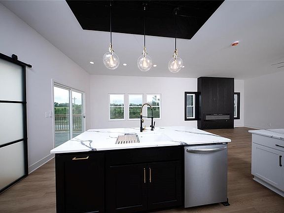 Large electric fireplaceThree-car garageCovered deckQuartz backsplashQuartz countertopsModern doorsMain suite
