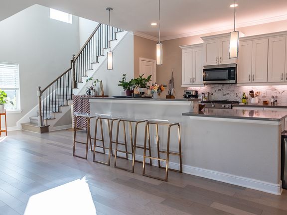 The kitchen features elegant Silestone countertops, an island, soft-close drawers and cabinets, a pantry, and KitchenAid appliances. The spacious primary suite is located downstairs with dual sinks, a separate shower, and a relaxing garden tub. Upstairs, you’ll find two additional bedrooms and a full bath. Additional features include recessed lighting, modern fixtures, and ceiling fans throughout.