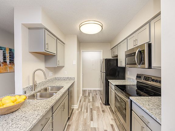 - Exterior features: Brand-New Nickel Fixtures, Garages*, Granite Countertops, High Ceilings, High-speed Internet Ready, On-Site Maintenance, On-Site Management, Online Services (Resident Portal & App), Outdoor Kitchen with Gas Grills and Fire Pit, Oval Tub, Package Receiving, Pet Friendly, Resident Social Events, Soft Close Shaker Cabinets, Wood Style Flooring