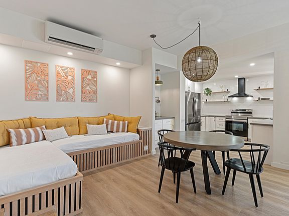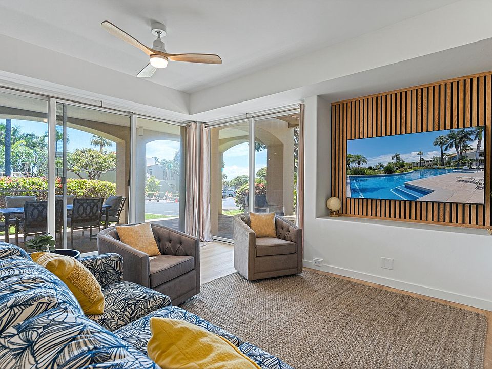 Palms at Wailea 203 is one of the best values in Wailea with a freshly completed remodel that's ready to move in or rent immediately! 2 bedroom unit ground floor unit with stylish premium finishes and warm welcoming decor to create the perfect Maui retreat. New furniture and luxury vinyl plank flooring throughout as well completely redone modern kitchen fully equipped with stainless steel appliances, new cabinets, new counters, new tile backsplash, and bespoke shelves. Bright and spacious great room has distinctive wood panel accent walls in the entertainment area and cozy built-in sitting area near the dining space. Spacious wrap-around lanai has approximately 280 sqft of covered space for outdoor dining and relaxation as well as a trellised uncovered lanai space approximately 160 sqft which connects to the primary suite. Quick access to the community pool and all the great shops and restaurants nearby.