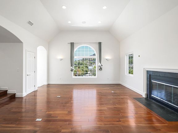 Step inside to a bright living room with 12-foot vaulted ceilings, a large picture window, and a cozy gas fireplace. A few steps up sits the formal dining room, offering peaceful neighborhood views and great natural light.