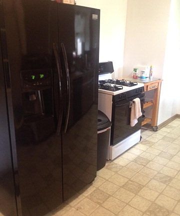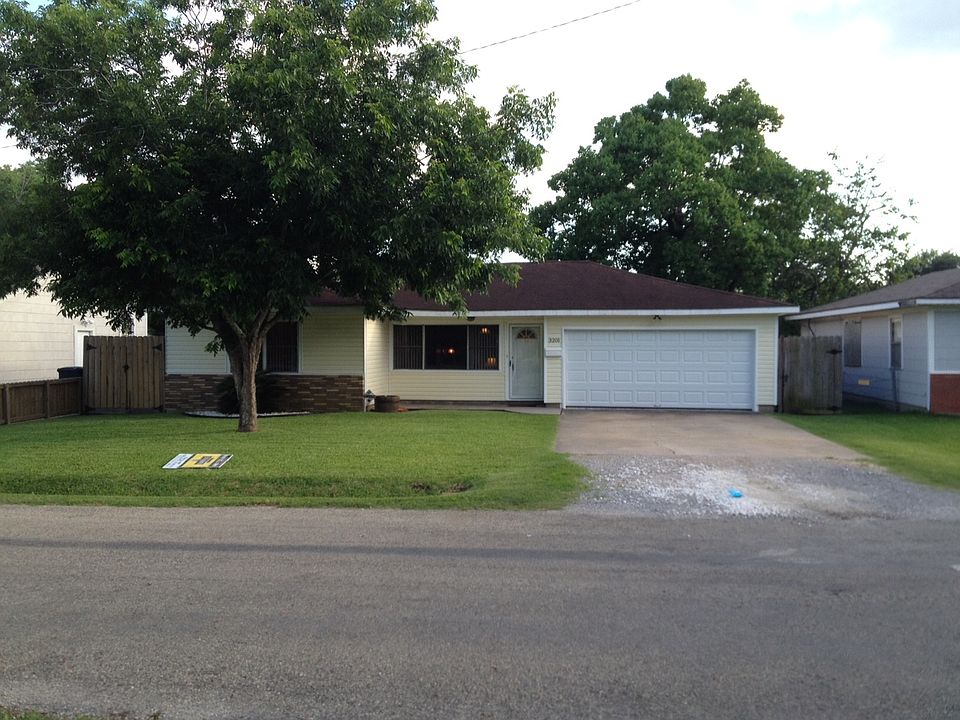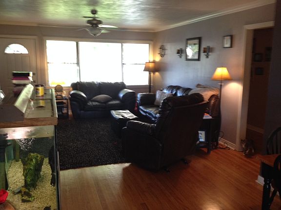 Lovely starter home, Living room and dining room combo with pretty wood floors, new kitchen tile cabinets, covered deck, wood privacy fence and storage building.