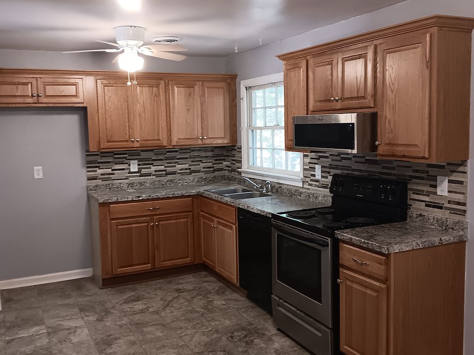 Rancher quiet Culdesac. Large lot w/wooded privacy in back yard. Freshly painted, New Kitchen cabinets, back splash, hot water heater, blinds, bath vanity, Bathroom flooring, new front door, new back door and back storm door, new deck flooring and back stoop, 6 panel interior doors throughout. Like new : Porcelean floor in kitchen and utility room, living room/hall and bedrooms LVP flooring. Rent is $1950 if paid by the first of each month. If interested 1. initial phone interview then 2. preliminary application (no charge) will be needed and reviewed by landlord and then 3. tenant can view house in person and formally apply ($100.00 application fee).
