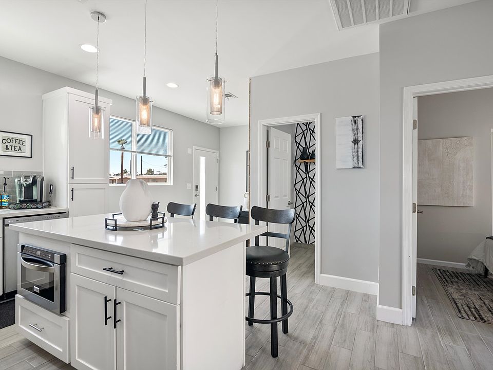 Half bathNice-sized backyardBedroom or officeModern kitchenTwo primary suitesBeautiful decorative wood wall