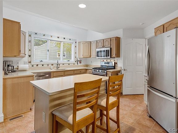 - Description: Island, eat-in, custom wood cabs & SS appliances