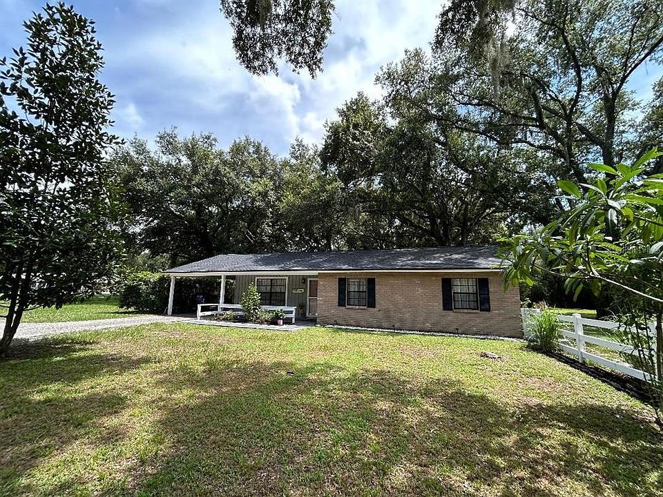PRICE REDUCED!! This beauty is in MOVE IN condition with 3 bedrooms and 2 bathrooms located on a gorgeous park like tree lined 1.14-acre lot! You will feel like you have your own little retreat but yet close to everything. It also features a large patio for entertaining! There are new cabinets and tile in the kitchen and baths and beautiful new laminate throughout. This home has been lovingly updated with a new roof, newer AC, water heater, most appliances, flooring and paint. This is a Gardener/homesteaders dream as the sellers have a few established raised beds with herbs, sweet potatoes and perennials that they are leaving! There are also several fruit trees, pineapple, banana, and dwarf plantains that are producing! In addition, there is a 11x 30 workshop that could be used for multiple purposes a one car garage plus a carport. NO DEED RESTRICTIONS BUT CONVIENTLY LOCATED!!