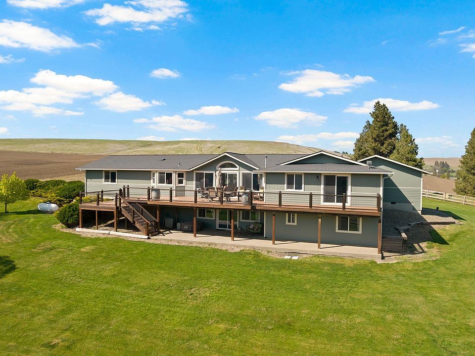 MLS# 283940 Welcome to your dream home—where modern comfort meets serene countryside living, on 22 acres of gorgeous Palouse land! Just 6 minutes (3 miles) from downtown Colfax along scenic Palouse River Road, this expansive 5-bedroom, 4-bath custom-built home offers over 4,500 square feet of beautifully updated space and unparalleled privacy.This home has been thoughtfully maintained and upgraded with fresh exterior paint, new carpet in the bedrooms, an updated vanity in the primary ensuite, and warm wood floors throughout the main living areas. Upstairs offers true one-level living with an open-concept layout, soaring vaulted ceilings, massive windows, and breathtaking sunrise and sunset views—no neighbors in sight!The heart of the home is the gourmet kitchen featuring quartz countertops, stainless steel appliances, a wine fridge, and custom cabinetry. The spacious primary suite includes a walk-in closet, ensuite bath with garden tub and separate shower, and direct deck access. Three additional upstairs bedrooms, a full bath, and a convenient guest half bath offer plenty of space for family and visitors.Downstairs is made for entertaining! Enjoy a huge bonus room with a wet bar crafted from reclaimed barn wood, a large guest bedroom, ¾ bath (plumbed for laundry), multiple storage rooms, and flex space perfect for an office, gym, or craft area. Below the garage, you'll find an oversized storage area for all your gear.Outdoor living is just as impressive—with a massive deck, lower patio with hot tub, and fully fenced backyard perfect for pets and kids. The lush garden includes raised beds, a greenhouse, 5 apple trees, 3 plum trees, raspberries, grapes, and a full sprinkler system covering the yard, garden, and tree-lined driveway.Ready for animals? This 22-acre property is fully fenced with professional 7-strand hot wire, a barn, pasture, chicken coop, and a large 24' x 40' shop with 200-amp power and lean-to for extra storage. Two wells supply abundant water, and wildlife sightings of moose, elk, and deer are a regular delight.With well-maintained roads—even in winter—this rare property offers the peace of country life just minutes from town.Don’t miss your chance to own this Palouse paradise—schedule your tour today!