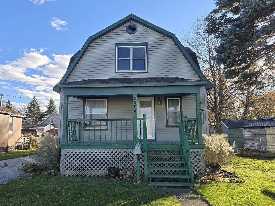 This charming 1910 Dutch Colonial Sears Catalog kit home has undergone a thoughtful renovation, preserving its historic character while incorporating modern conveniences. The foyer showcases ceramic tile and carpeting, perfect for a home office or library. The living room features natural wood flooring, and the dining room flows seamlessly onto a 12' x 16' deck just beyond the patio door. The kitchen boasts ceramic tile counter, backsplash and flooring complemented by generous oak cabinetry. An open oak staircase ascends to two bedrooms and a spacious full bath. A practical back entryway serves as a laundry room, complete with a toilet that can be easily enclosed for convenience. Other features include some newer vinyl windows, a freshly painted basement, and a fenced yard with a shed. Schedule a tour today.