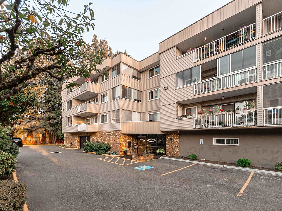 Welcome to Maplewood Manor, a 55+ community offering 1,034 sq. ft. of comfortable living. This well-kept 2 bedroom + den, 1 bath condo features newer laminate flooring, new windows, and fresh paint. The kitchen offers plenty of cabinetry and flows into a spacious living and dining area with access to a huge covered balcony with storage. Enjoy large bedrooms, in-suite laundry, and updated patio. Fantastic amenities include a workshop, party room, and amenity room. Strata fee covers heat, BC Hydro, and hot water. Includes 1 underground parking. Conveniently located near shopping, medical services, and transit in a quiet setting.