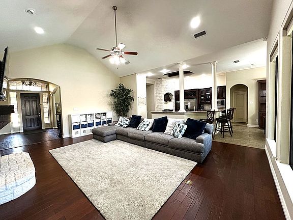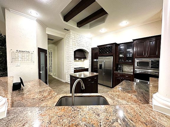 This spacious single-story residence sits on a quiet cul-de-sac in the desirable Lakes of Creekwood Addition and boasts 4 bedrooms, 3 bathrooms, a full-sized office, a formal dining area, and a dedicated theater room. Step inside to find a wide-open common area, ideal for family gatherings and entertaining. The high ceilings throughout the home create an airy and expansive feel, while the incredible amount of natural light floods the space, making it warm and inviting. The heart of the home is the beautiful kitchen, featuring ample storage in custom cabinets. This chef's delight is perfect for culinary adventures and family meals. Adjacent to the kitchen is a full-sized laundry room, adding convenience to your daily routine. The large master suite is a true retreat, featuring private access to the pool area, an oversized closet, and a large en-suite bathroom. The 2nd and 3rd bedrooms share a convenient Jack and Jill bathroom, perfect for families. The backyard is an entertainer’s paradise. Enjoy the screened-in patio, relax in the spa, take a dip in the swimming pool, or fire up the grill in the designated grilling area. The outdoor space is designed for year-round enjoyment and gatherings. Inside, you’ll find custom built-ins in the breakfast nook, living room, and office, adding both style and functionality. The mature trees surrounding the property provide shade and enhance the overall beauty of the landscape. Zoned for excellent schools, this home offers everything you could want in a family residence. Don’t miss the opportunity to make this stunning property your own! Buyers agents welcome!