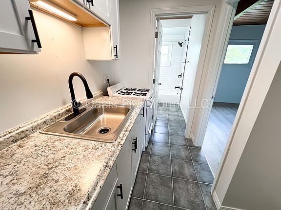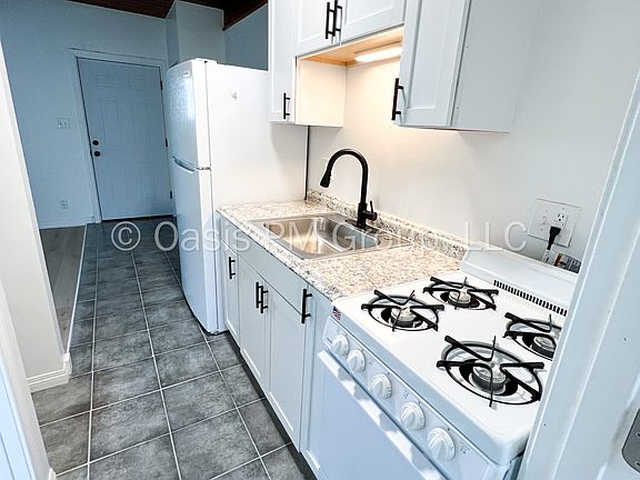 Remodeled kitchen area includes essential appliances like a refrigerator and stove, white cabinets providing tons of storage, granite-look countertops, and a deep stainless steel sink. Matte black fixtures.