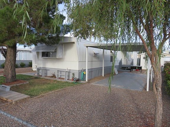 lots of work has gone into this incredibly well maintained manufactured. Recently replaced the flooring and tub in the bathroom. Set as real property this manufactured offers front and back deck. paint inside and out. Low maintenance plants. Coated roof. laminate wood. front bay window. thermal drapes and mini blinds. swamp cooler and window units. Outside is a beautiful board walk surrounding the house. There is a quick shut off water connect at the corner of the house. Large access the underneath of the house. Plants are all on a timed drip system. Hoses are in boxes to help prevent freezing. Cute little yards accents. Lots of wonderful roses. The workshop has heating and cooling. Single care carport. This is a must see Priced to sell. This one will not last long. Make your appointment to see it before it is gone.