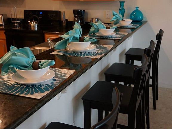 Welcome to this fully furnished 4 BEDROOMS and 3/1 Bathrooms home in one of Orlando's top family rental destinations. Located in spectacular gated community COMPASS BAY. The spacious 2 story layout provides open plan living, GRANITE COUNTER TOP, MEDIUM BROWN CABINETRY with stainless steel pull handles, all Whirlpool APPLIANCES, including microwave, range, dishwasher and a bottom freezer refrigerator. The living room at the rear of the home opens directly onto the spacious paver patio with a pond vue. The spacious master bedroom and three others are on the second floor. The garage can been converted to a game room for the futures home owners. COMPASS BAY offers fantastic amenities such as outdoor BBQ grills overlooking a small retention pond, a great community pool with pool cabanas and a 2 playgrounds! The Compass Bay are located approximately 0.6 miles to US Highway 192 which offers majors shops and restaurants.